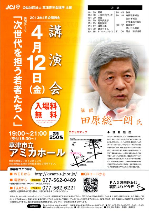 次世代を担う若者たちへ 2013/04/11 明日、4/12(金)19~21 草津市アミカホールにて草津青年会議所公開例会を開催致します。今回は、「次世代を担う若者たちへ」と題して田原総一朗さんに講演頂き、後半は、草津青年会議所理事長、直前理事長とともにパネルデイスカッションをします。是非、興味を持たれた方のご参加をお待ちしています。
